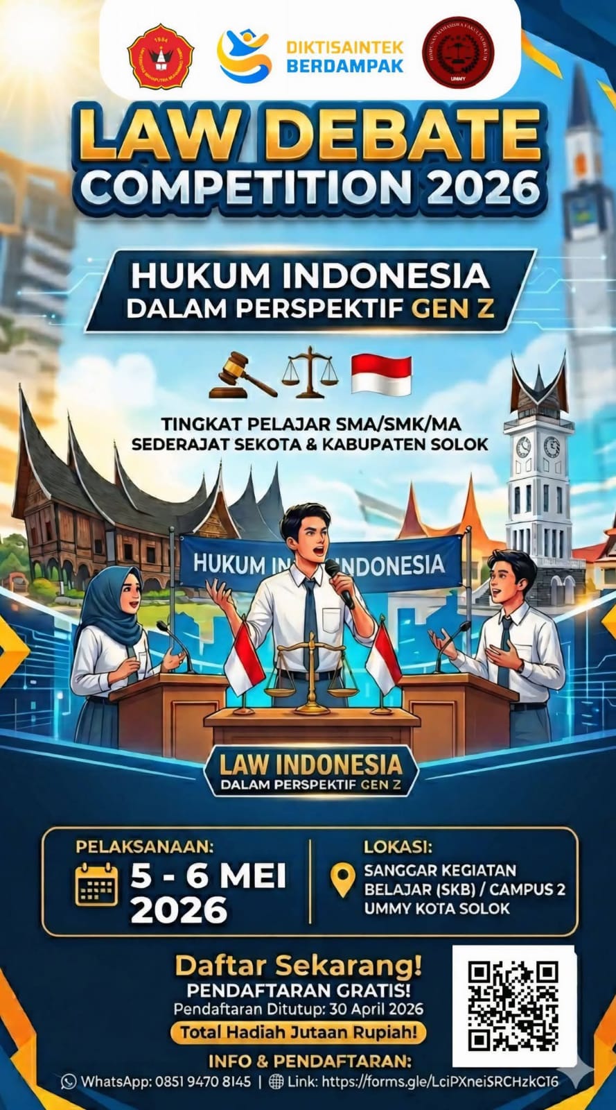 Solok – (SIN) – Semangat berpikir kritis dan keberanian berargumentasi akan segera menggema di Kota Solok melalui ajang Law Debate Competition 2026, sebuah kompetisi debat hukum bergengsi yang menyasar pelajar SMA/SMK/MA se-Kota dan Kabupaten Solok. Kegiatan ini digagas oleh Himpunan Mahasiswa Ilmu Hukum UMMY Solok bekerja sama dengan Pusat Studi Hukum dan Humaniora Meester Yamin Law Center.