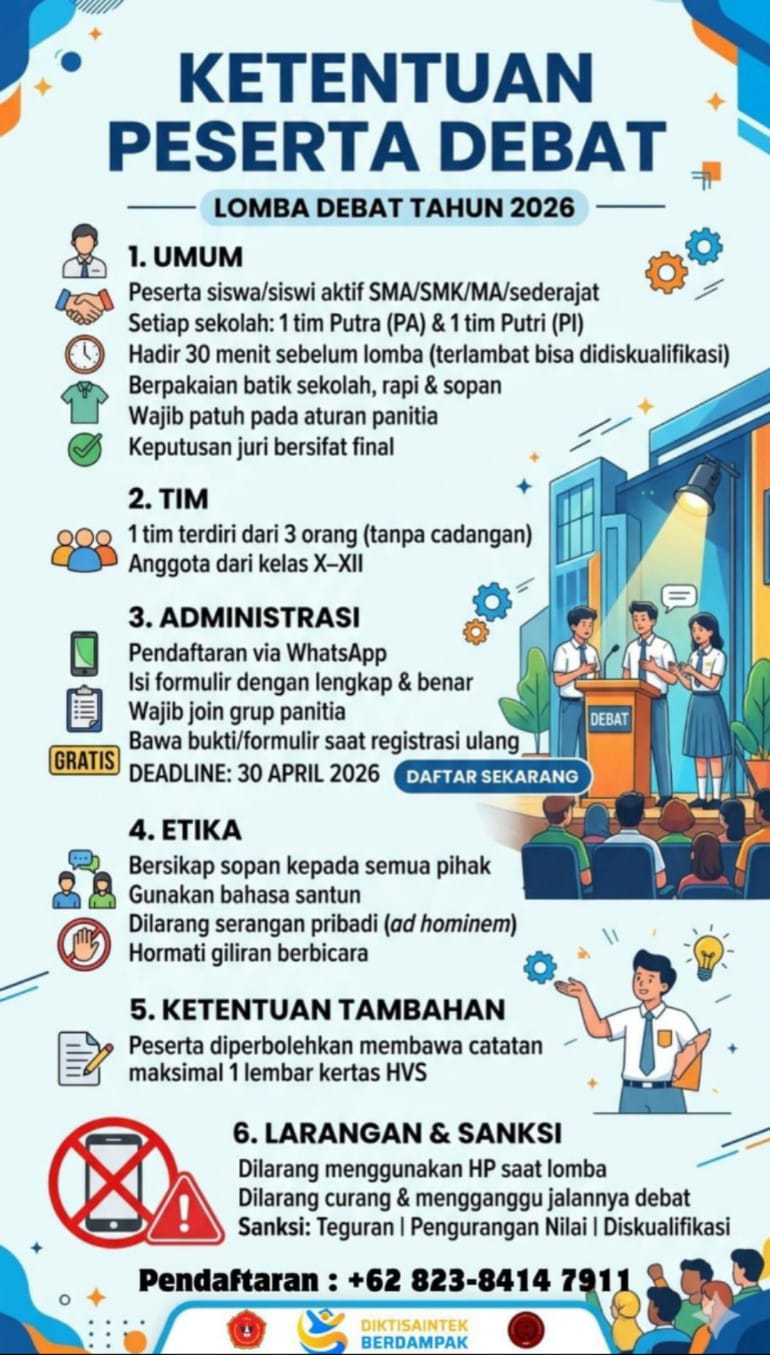 Pendaftaran sendiri akan ditutup pada 30 April 2026 pukul 00.00 WIB. Panitia mengajak seluruh pelajar yang memiliki minat di bidang debat dan hukum untuk memanfaatkan kesempatan ini.