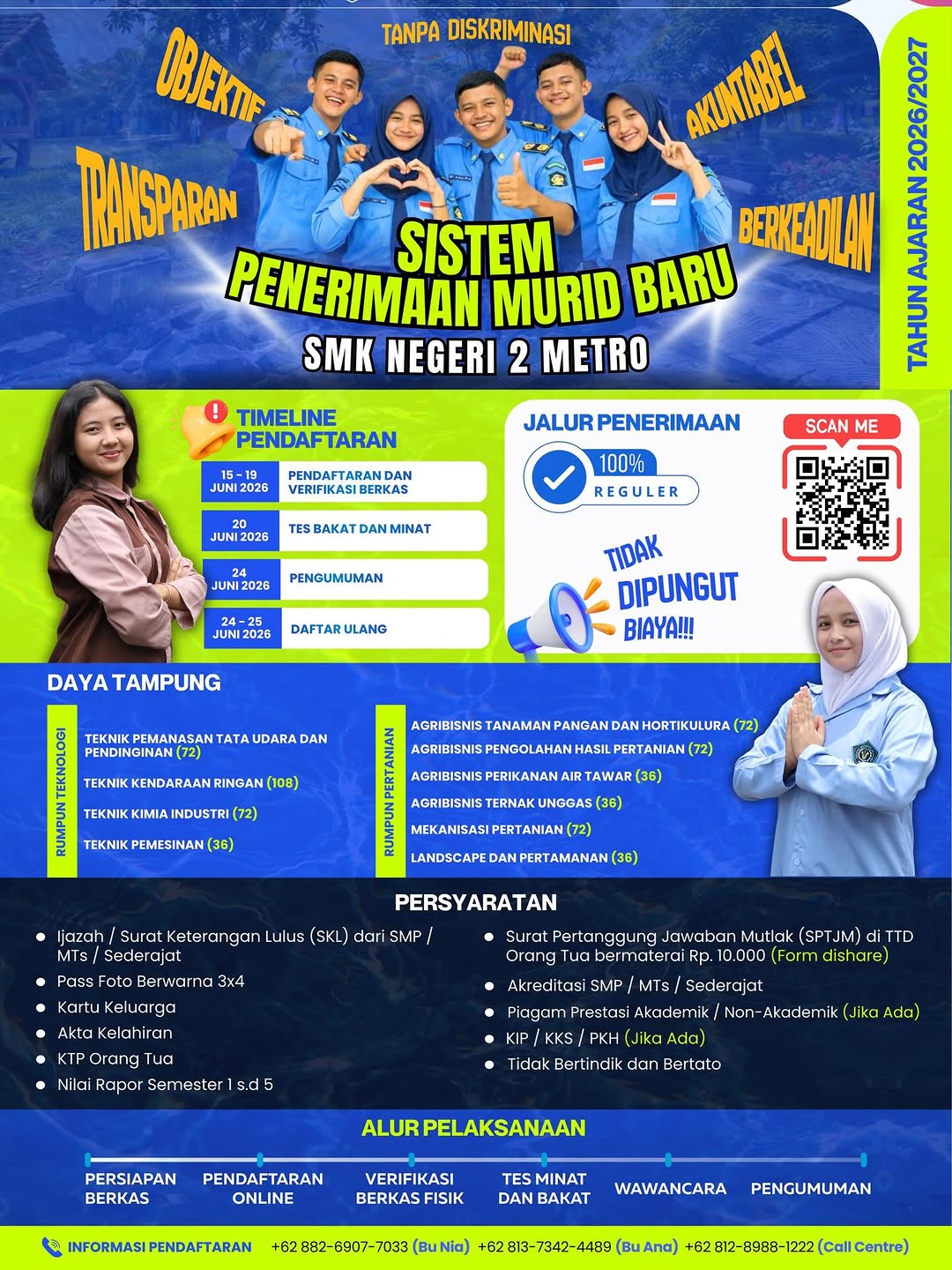 Informasi Pendaftaran Bisa Buka Instagram smknegeriduametro atau bisa menghubungi via WhatsApp dengan nomor: +62 882-6907-7033 (Bu Nia) +62 813-7342-4489 (Bu Ana) +62 812-8988-1222