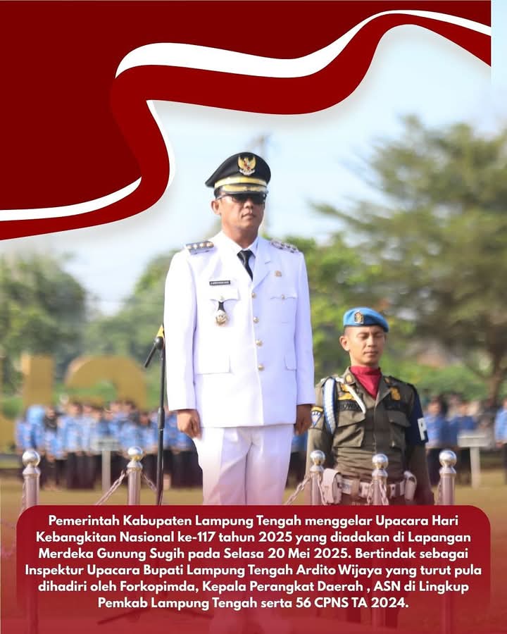 Lampung Tengah – (SIN) – Amanat Menteri Komunikasi dan Digital RI Meutya Viada Hafid yang dibacakan langsung oleh Bupati Ardito Wijaya pada hari Kebangkitan Nasional tahun ini agar dimaknai dengan kembali membuka halaman penting dari sejarah perjuangan bangsa, tentang kebangkitan kesadaran, semangat persatuan dan keberanian menolak untuk terus terjajah. Dalam momen ini kita meneguhkan kembali arah perjuangan bangsa dan dalam semangat.