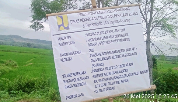 Karawang – Jawa Barat – (SIN) – Proyek pembangunan drainase CV Maju Bangkit di dusun Jawa Raya Desa Mulangsari Kecamatan Pangkalan yang bersumber dari dana APBD Kabupaten Karawang tahun 2025 dengan harga borongan Rp. 189.070.000,