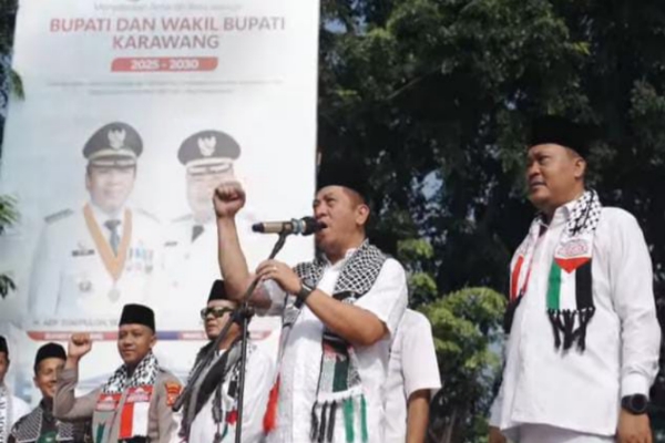 Bupati dan Wakil Bupati Karawang berorasi di aksi solidaritas bela Palestina.