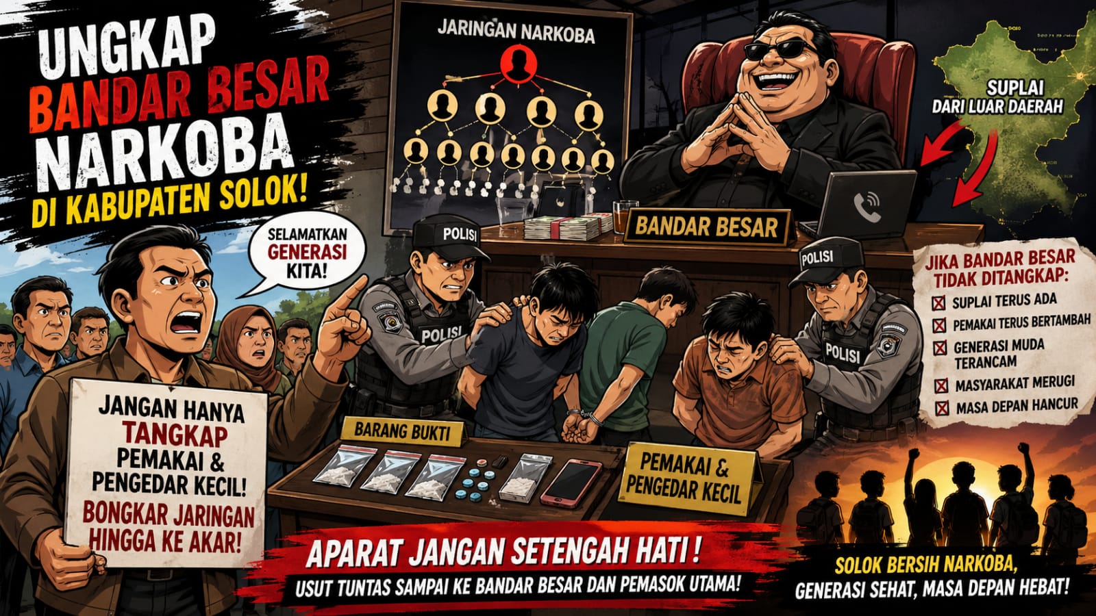Peredaran narkoba bukan hanya persoalan hukum, tetapi juga ancaman serius bagi masa depan generasi muda di Kabupaten Solok. Oleh karena itu, pengungkapan hingga ke tingkat bandar besar dan pemasok utama menjadi harapan utama masyarakat demi menciptakan lingkungan yang lebih aman dan bersih dari narkoba.