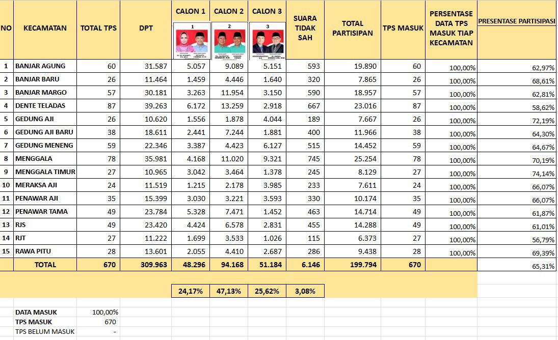 Partisipasi pemilih di Pilkada Tulang Bawang versi hitung cepat Rakata di angka 64,93%. Tingkat kepercayaan 99%, dengan toleransi kesalahan 2,43%.
