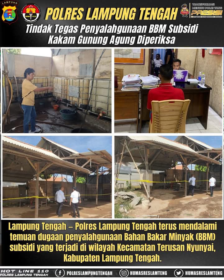 Lampung Tengah – (SIN) – Polres Lampung Tengah terus mendalami temuan dugaan penyalahgunaan Bahan Bakar Minyak (BBM) subsidi yang terjadi di wilayah Kecamatan Terusan Nyunyai, Kabupaten Lampung Tengah.