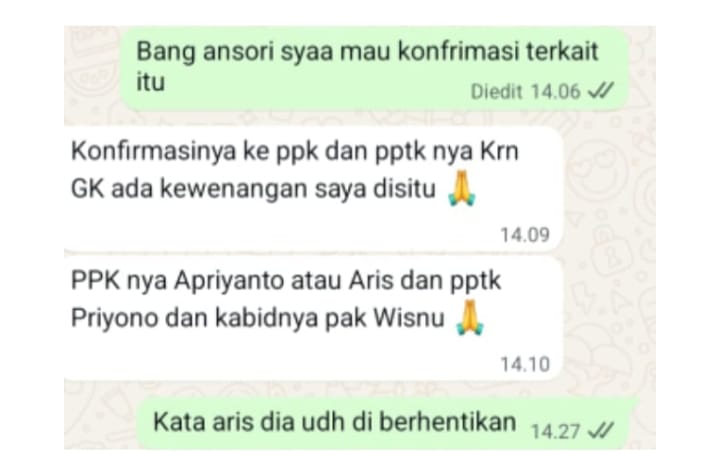 Setelah konfirmasi kepada Aris Selaku PPK kegiatan MCK menjawab tidak tahu menahu bahkan menyampaikan dirinya akan diganti dari jabatan PPK. “Hal ini menjadi tanda tanya, ada apa sebenarnya?,” ungkap Ferry.