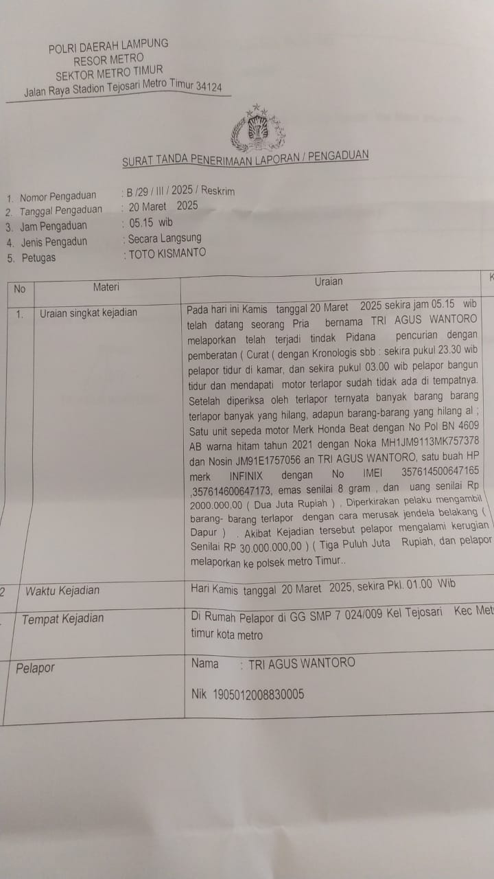 Tri Agus Wantoro, SE mengatakan kepada media ini telah melaporkan kejadian peristiwa pencurian dengan pemberatan (Curat) di Mapolsek Metro Timur, Polres Metro Polda Lampung, Kamis 20 Maret 2025