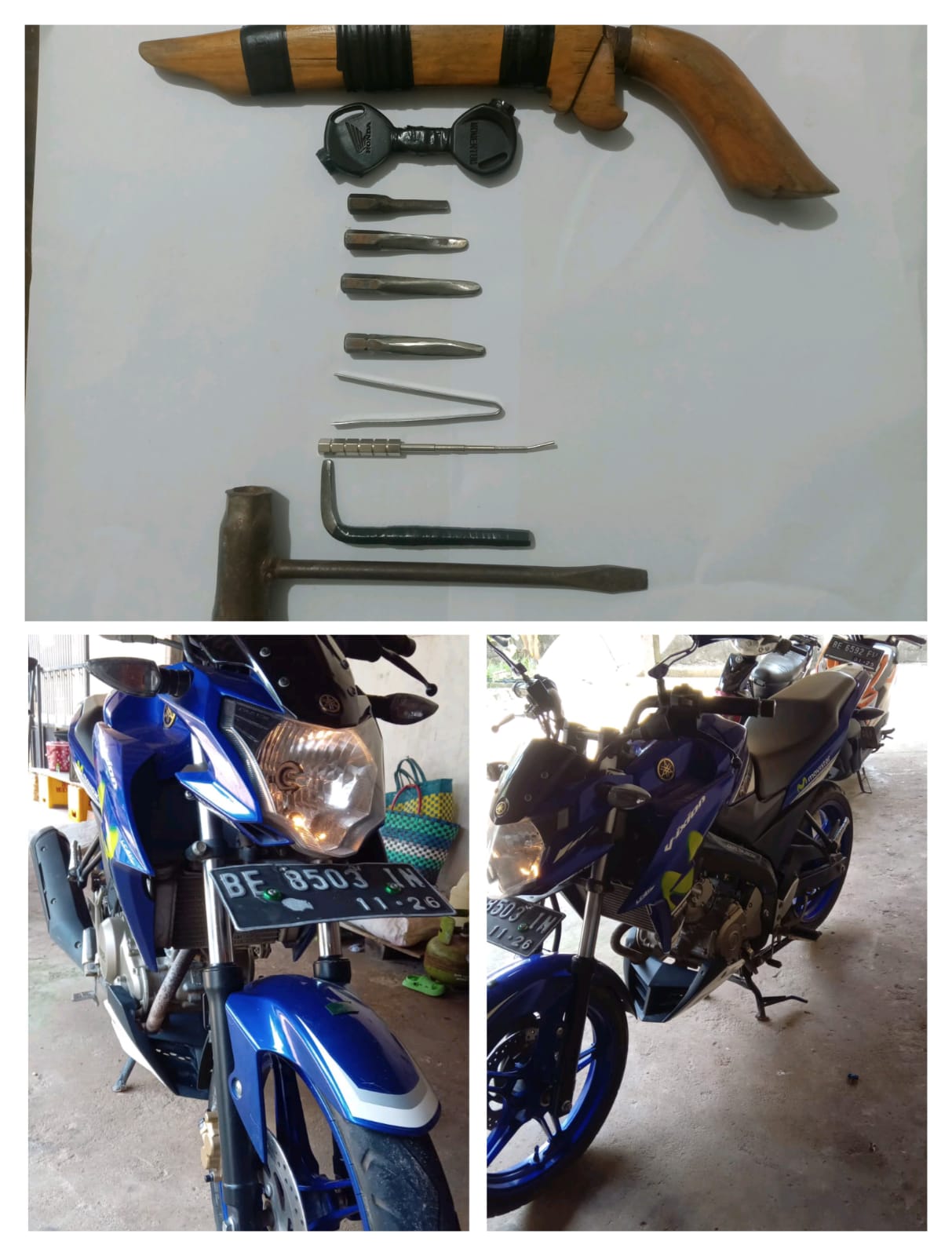 Sepeda motor milik korban jenis Yamaha Vixion warna biru dengan nomor polisi BE 2799 GNZ diketahui hilang saat istri korban melihat pintu garasi rumah sudah terbuka.