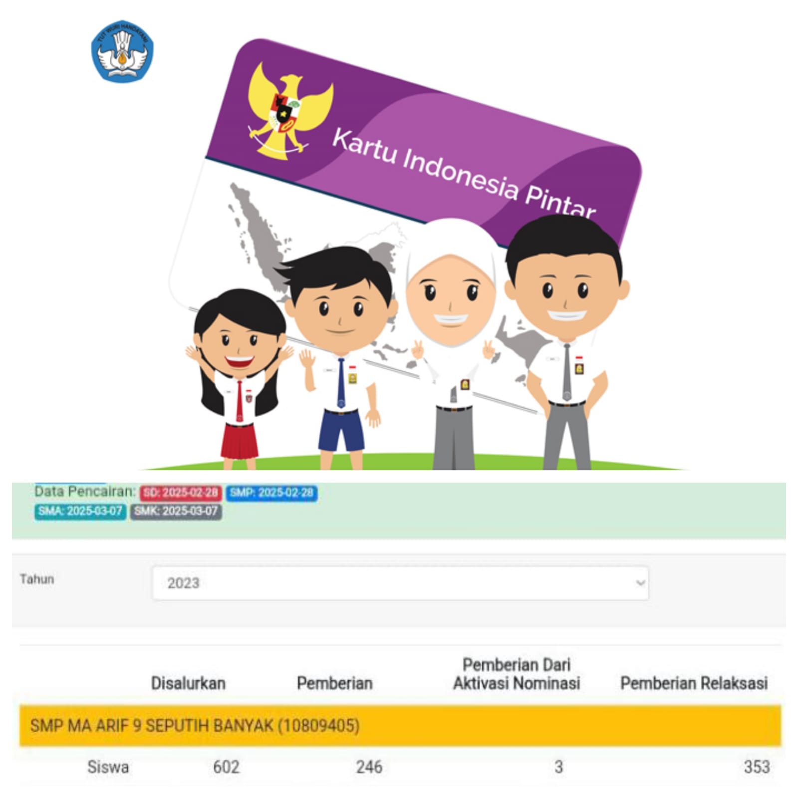Pasalnya, Hasil pantauan tim melalui data penerima PIP tahun 2023, murid SMP MA’ARIF 9 Seputih Banyak adalah sejumlah 602, sedangkan jumlah murid menurut dapodik adalah 710, hanya 108 murid yang tergolong mampu.